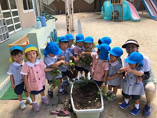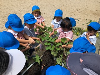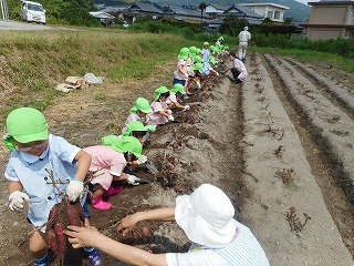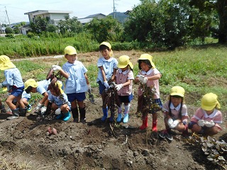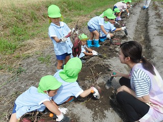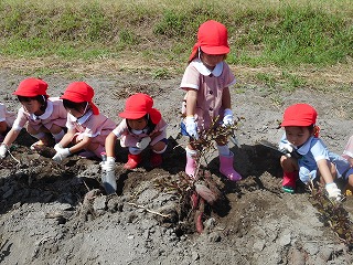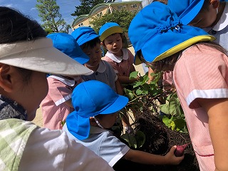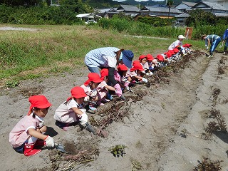 いもを掘るときは、傷つけないようにいものまわりの土を優しく掘る約束をし、いよいよ開始!!