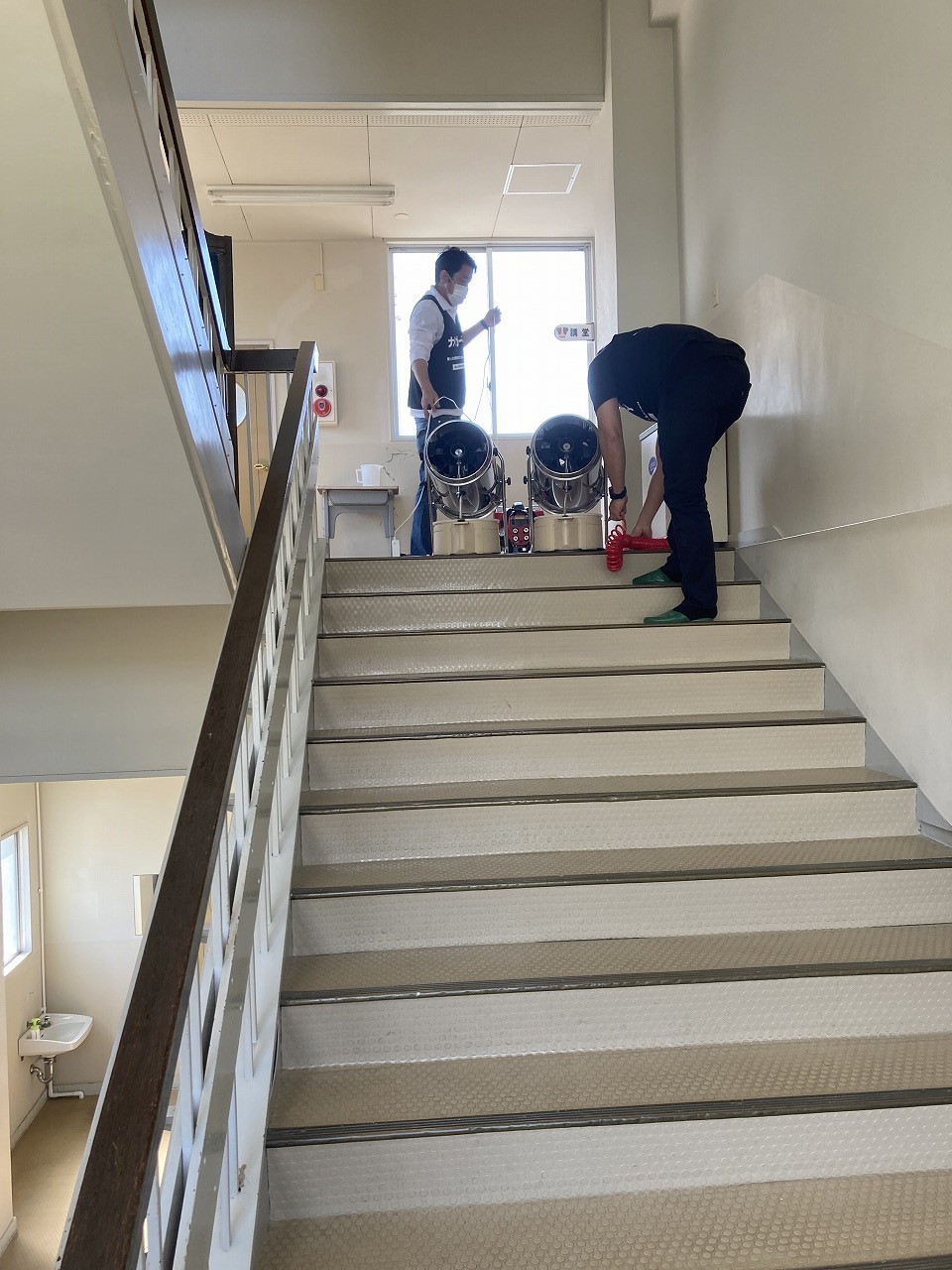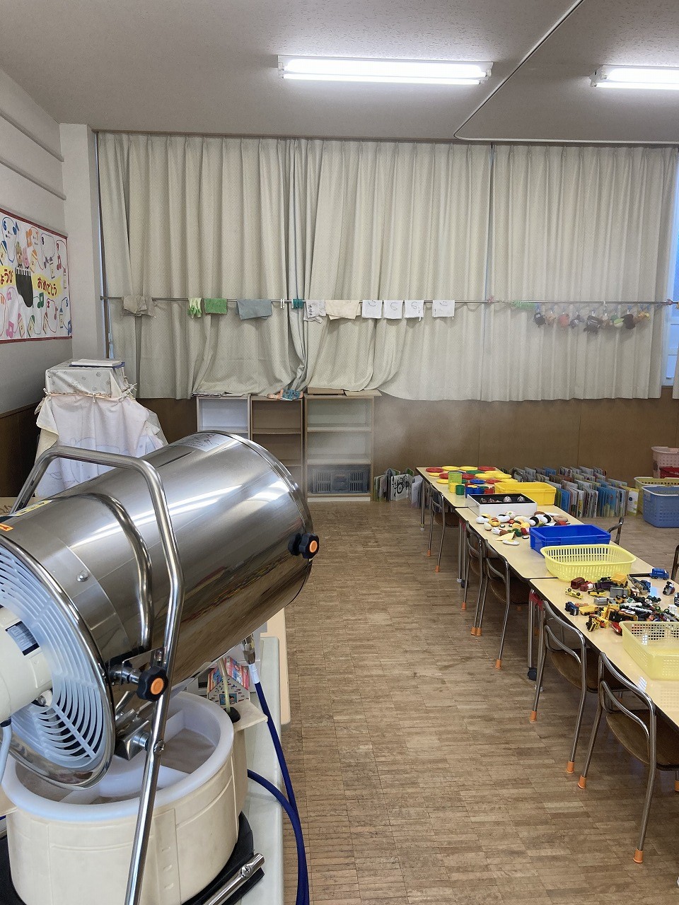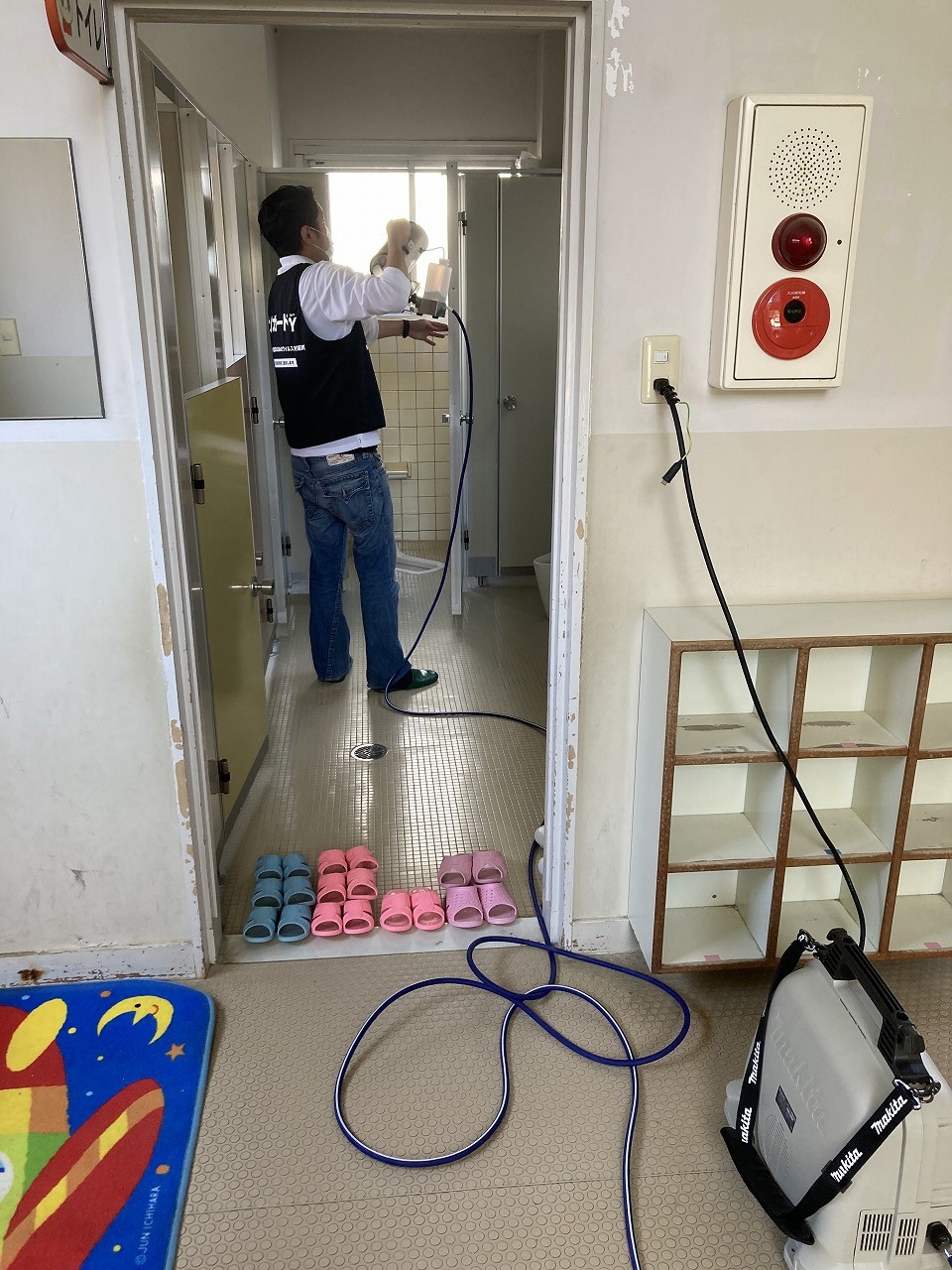 本園では、こうした中でも園児の健康と安全を第一に考え、持続的に保育の機会を保障する取り組みとして、ゴールデンウィーク期間中に「ナノガードγ(ガンマ)」の消毒作業を、全保育室やトイレ、廊下、通園バス等に実施致しました。